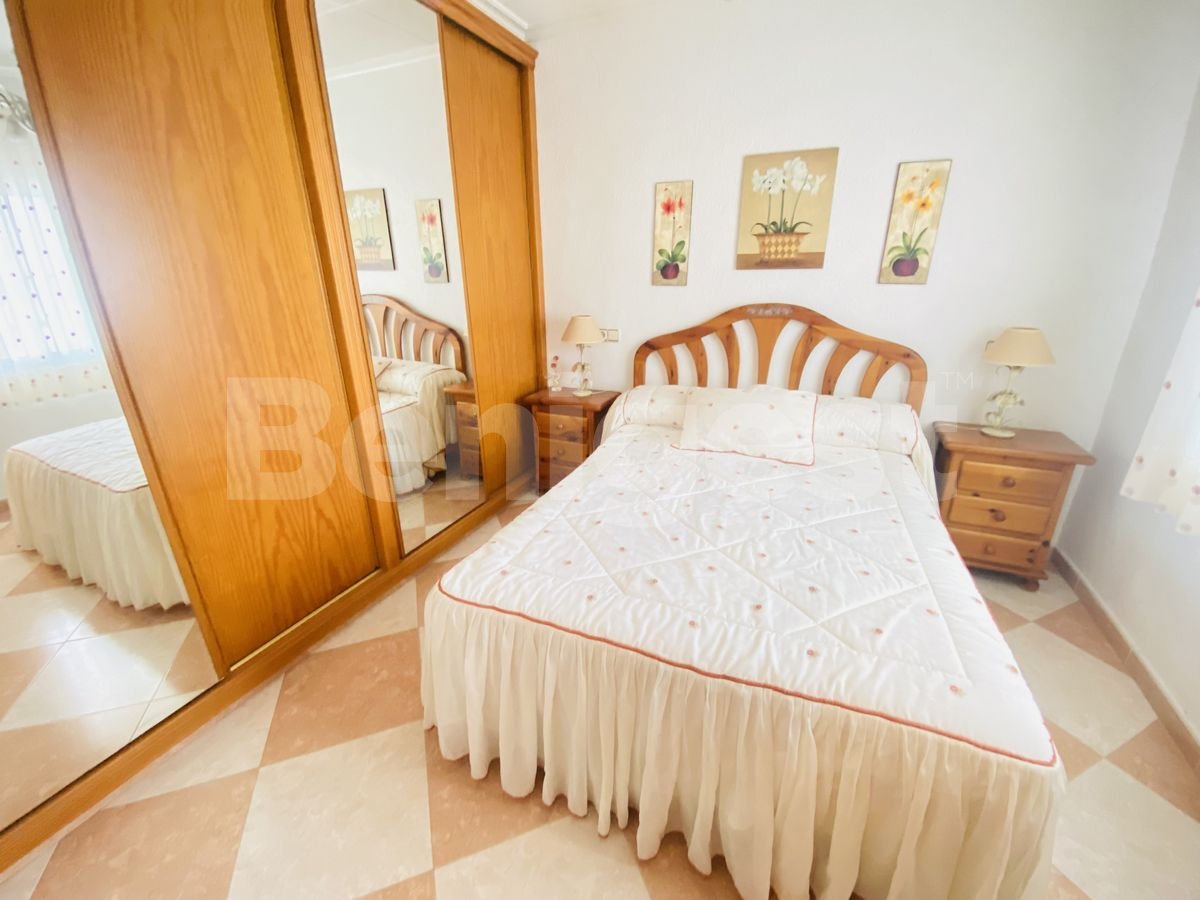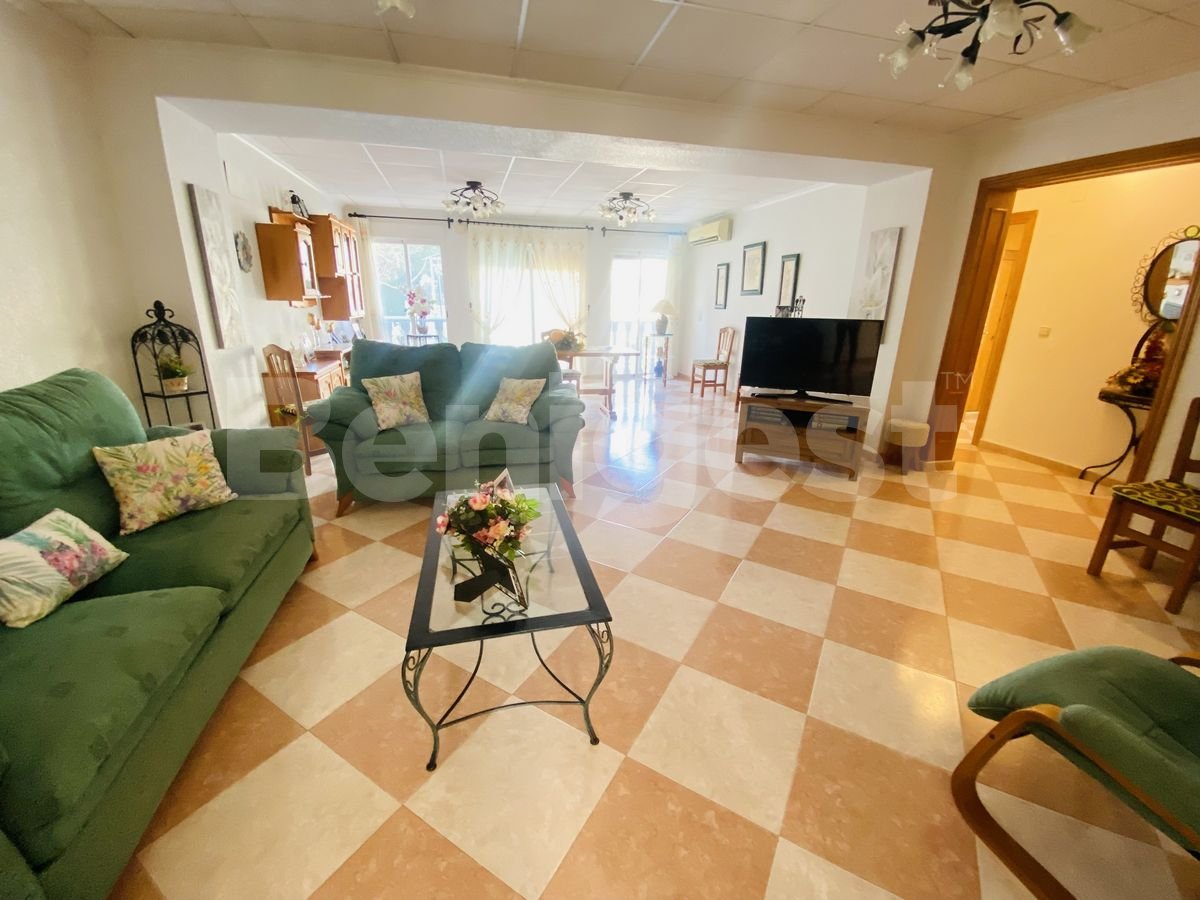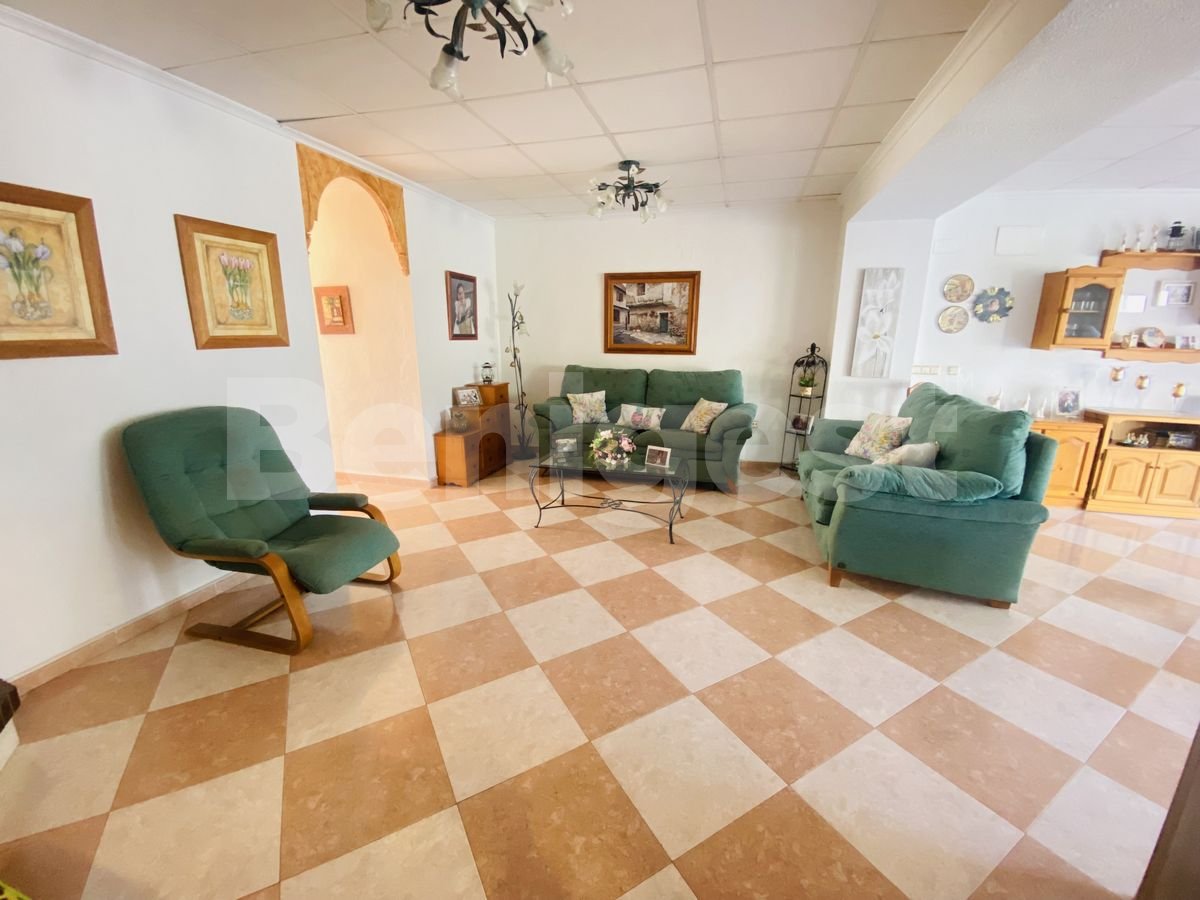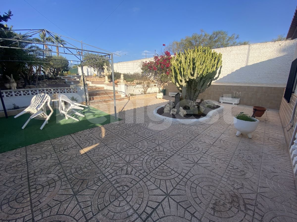 Spacious finca set back from the main road in Montemar, Algorfa on the Costa Blanca South. The property was built in 1989 but has been totally refurbished in 2012, with large extension and now consists of three double bedrooms, two of them with double beds and the other with two singles, all have fitted wardrobes, large spacious living and dining area with log fireplace and air conditioning, a bathroom with walk in shower and a large fully fitted separate kitchen which includes fridge freezer, oven, gas hob, dishwasher, microwave and toaster.